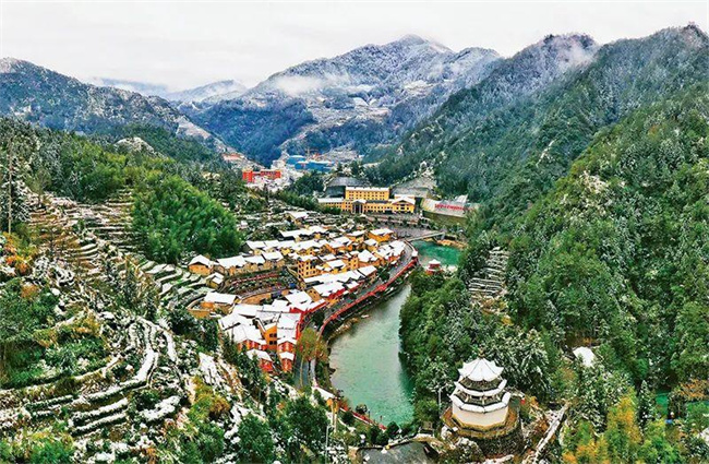 下党乡位于闽东大山深处,是福建省宁德市寿宁县最边远的山乡。1988年建乡时,人均年收入不到200元,贫困率达到70%,是宁德4个特困乡之一。在福建工作期间,习近平同志曾“三进下党”调研指导扶贫工作。在他的长期关怀和亲自推动下,下党乡持续奋斗,实现了“天堑变通途、旧貌换新颜”。2021年,下党乡农民人均可支配收入达到20055元,10个行政村村集体经济收入均达20万元以上。图为下党雪景。福建省委宣传部供图